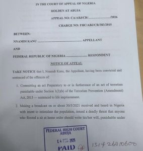 The leader of the Indigenous People of Biafra (IPOB), Nnamdi Kanu, has formally appealed his conviction and life sentence imposed by the Federal High Court in Abuja.
